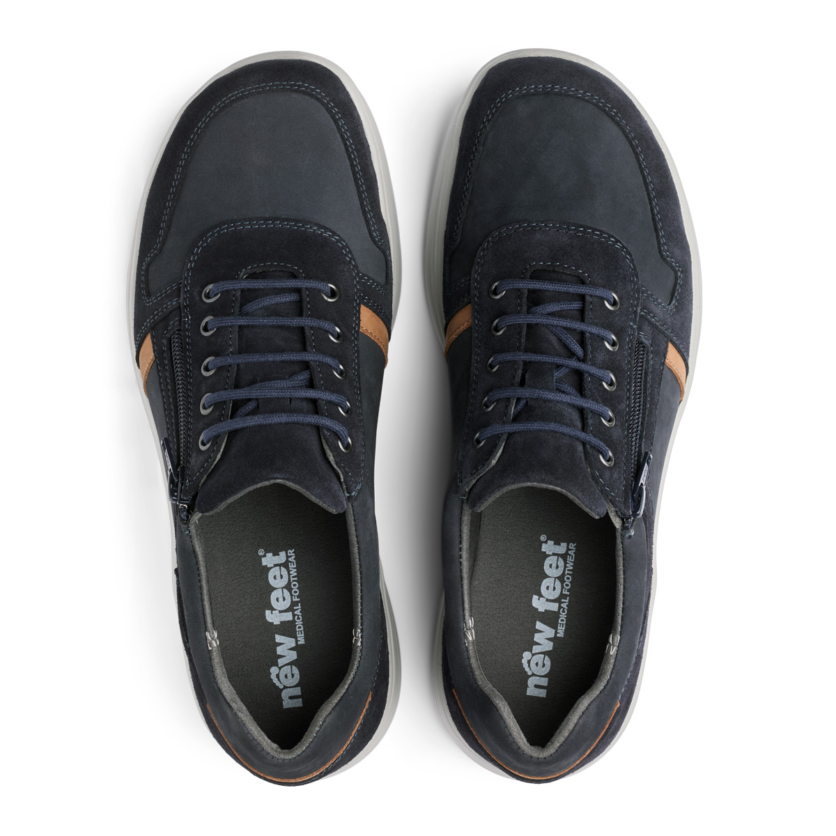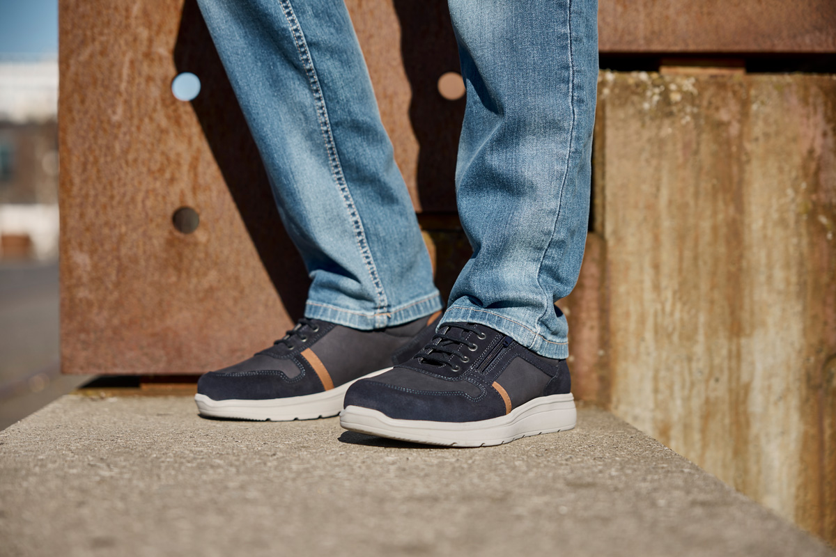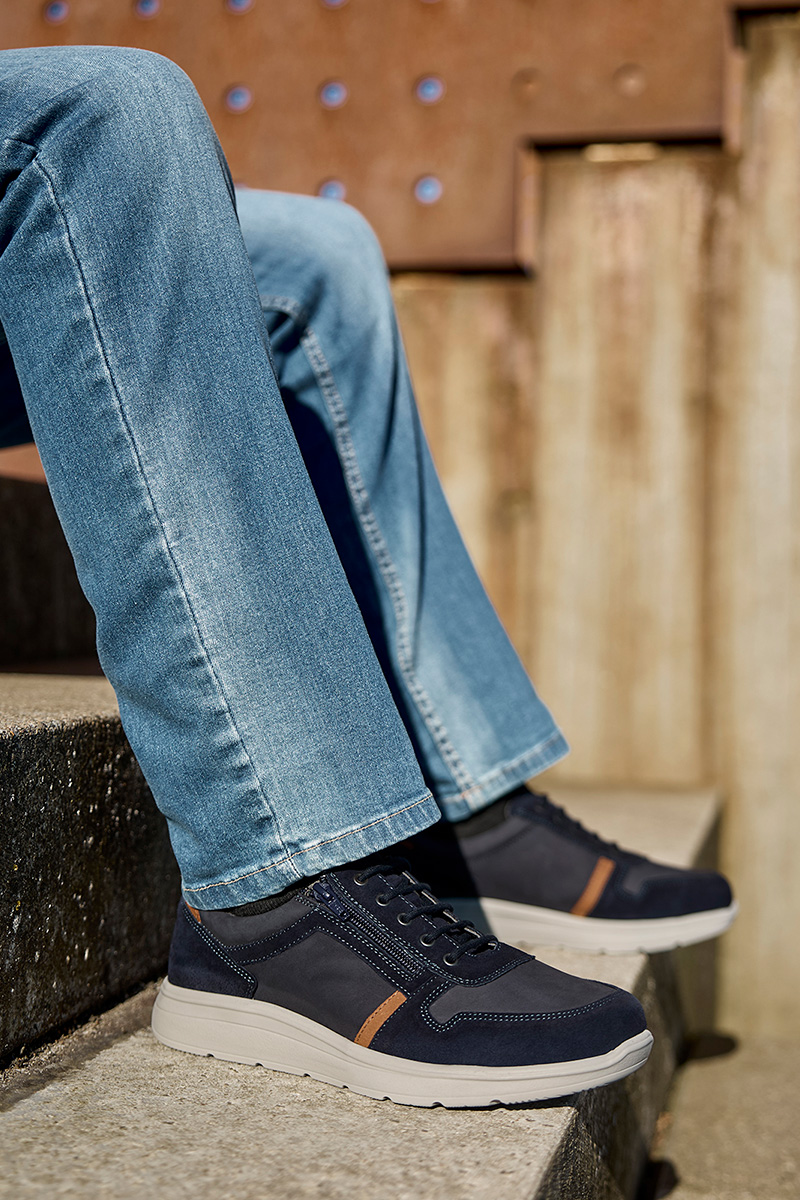 New Feet 241‑25‑1540 on sporttinen miesten kävelykenkä, jossa yhdistyvät tyylikkyys ja ortopedinen mukavuus. Päällinen on valmistettu pehmeästä nubukkinahasta ja OrthoStretch®‑nahasta, joka mukautuu jalkaan ja antaa varpaille tilaa. Tyylikäs sininen sävy sopii niin arkeen, kuin tyylikkäämpiikin tilaisuuksiin. Nauhat ja sivussa kulkeva vetoketju mahdollistavat tarkan säädön, jolloin kenkä istuu jalassa sekä ne on helppo pukea.