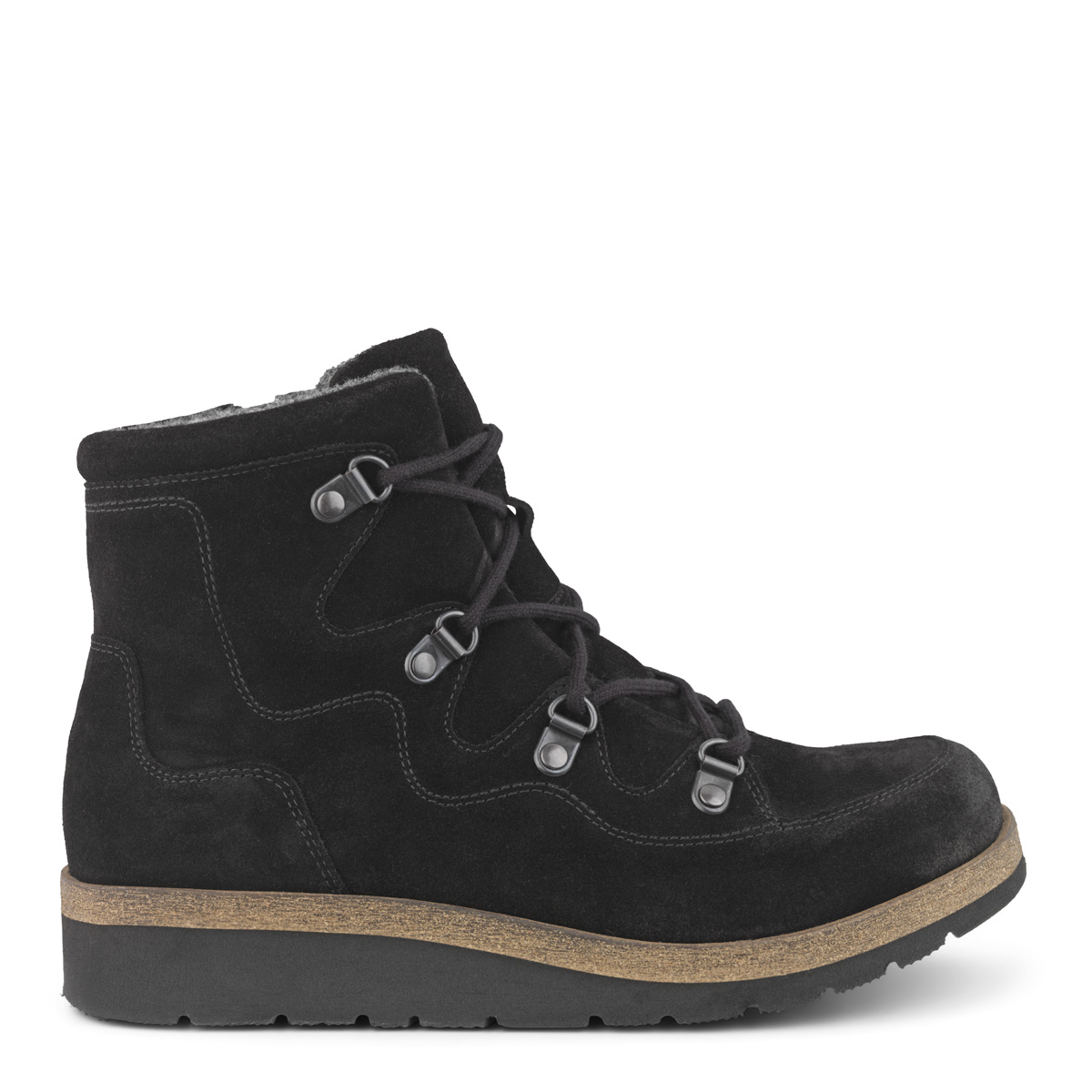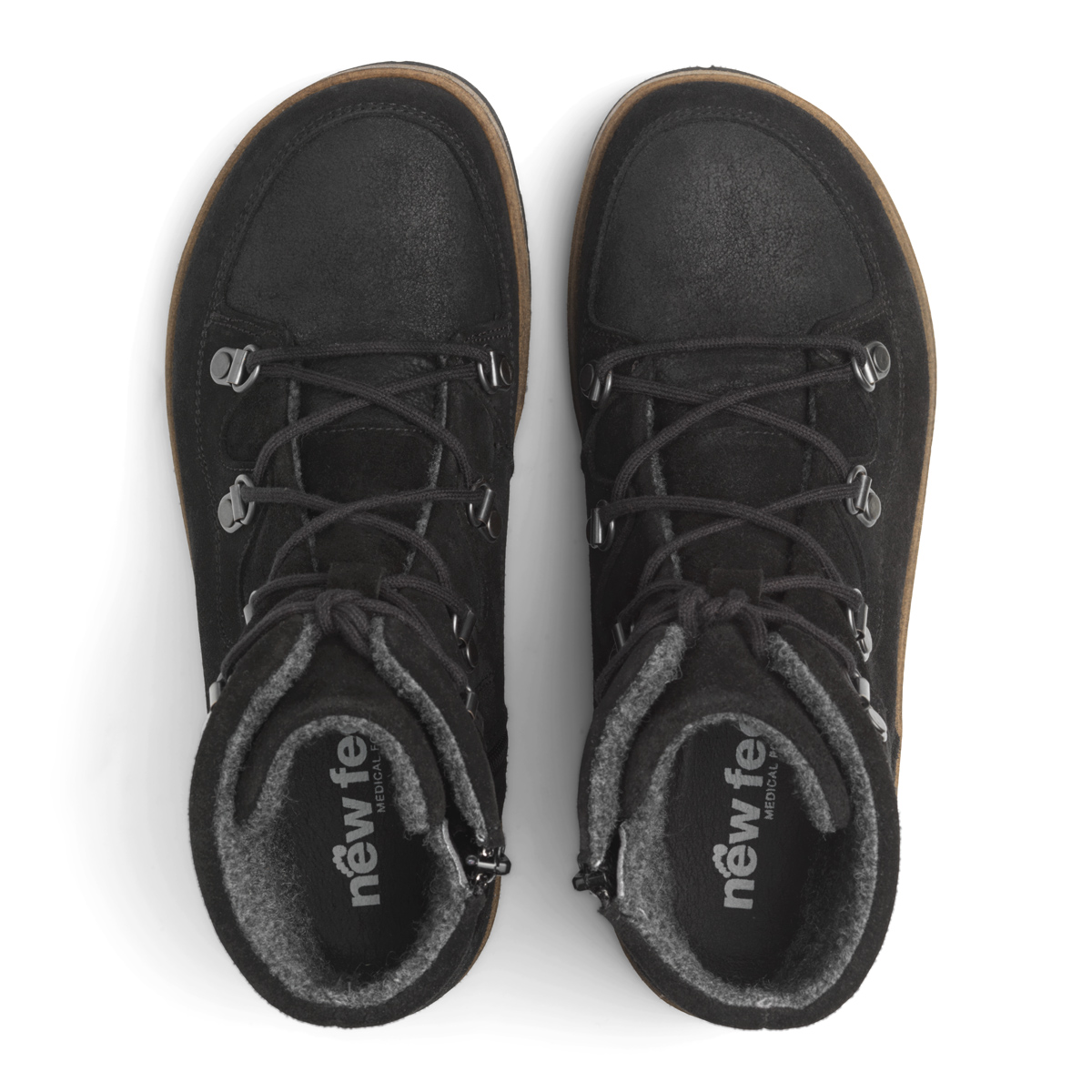 New Feet 192‑82‑1810 on musta naisten nilkkuri, joka yhdistää vedenpitävän Hydro Suede ‑nahkan, Picos‑vuorauksen TEX‑kalvolla ja Orthostretch®‑joustavuuden. Jalkineessa on sekä nauhat että sisäsivuilla oleva vetoketju, joten istuvuutta voi säätää helposti. 6 mm:n Korrektor® Soft ‑pohjallinen tarjoaa tukea ja vaimentaa iskuja ja sen tilalle voidaan vaihtaa oma yksilöllinen pohjallinen. Kevyt EVA‑ulkopohja antaa rullaavan askelluksen ja on lähes painoton. Lesti on Medium (M), joten tila ei lopu kesken: varvaskappaleen joustava nahka antaa lisätilaa vaivaisenluulle tai vasaravarpaalle. Täydellinen valinta herkille jaloille, diabeetikoille tai kaikille, jotka arvostavat lämpimiä, kuivia ja mukavia talvikenkiä.